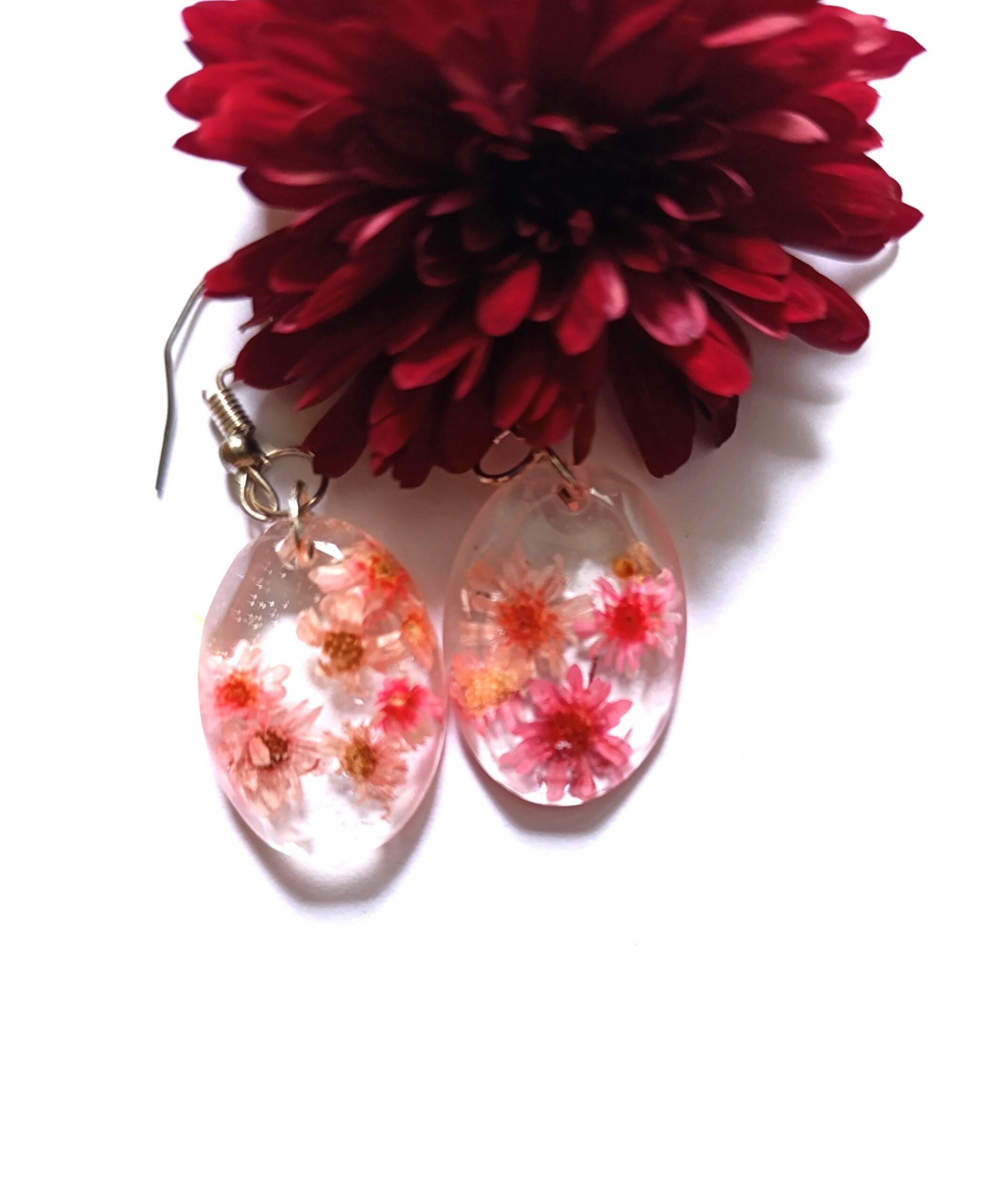 Náušnice z křišťálové pryskyřice obsahující maličké kvítky Comanthery (květina pocházející z tropické Jižní Ameriky). Oválky 2 cm.
