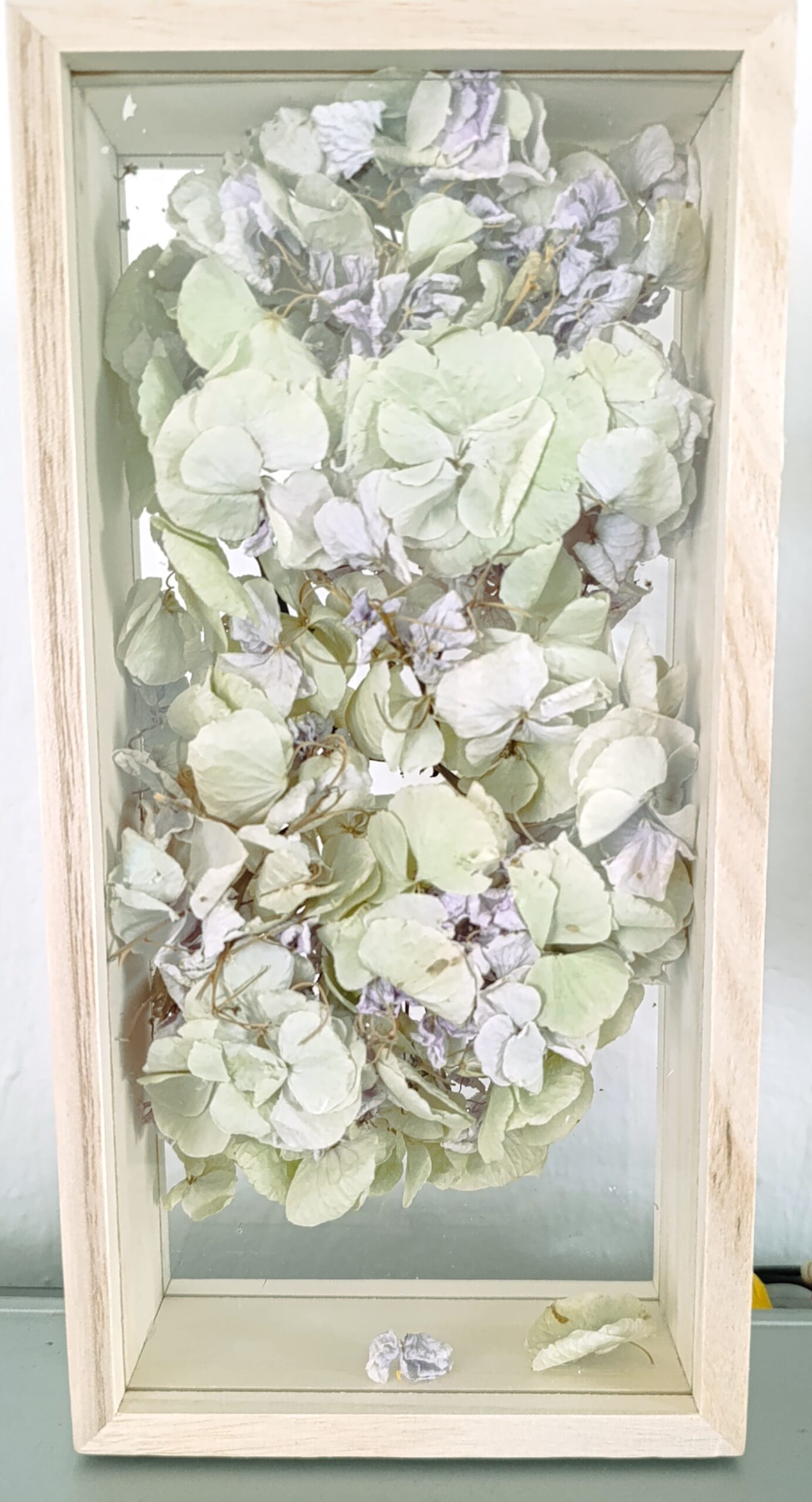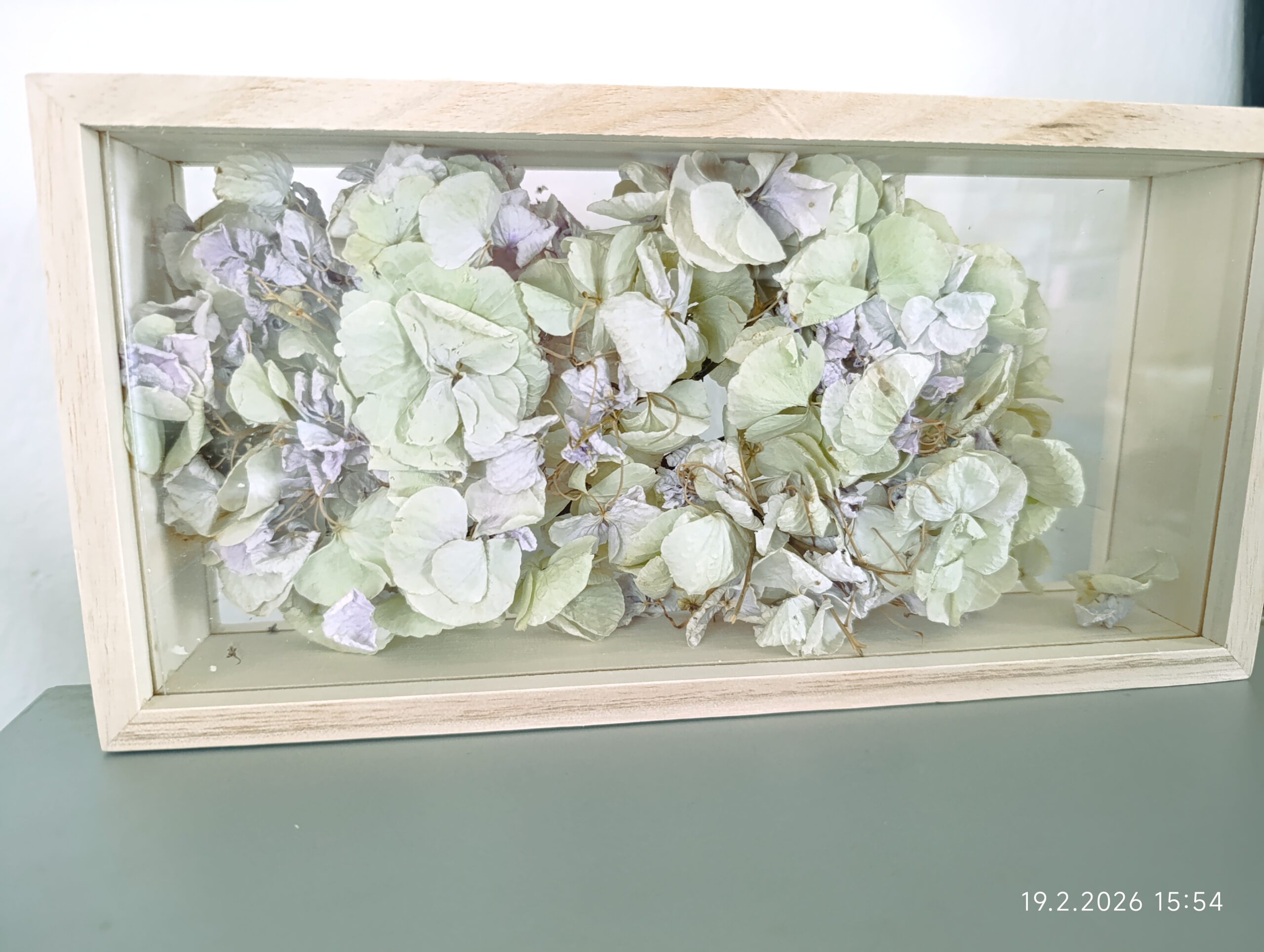 Sušená hortenzie v dřevěném dutém rámečku, rozměr 13×26 cm. Obojí možné na stojato nebo naležato. Vynikne především na tmavé stěně.