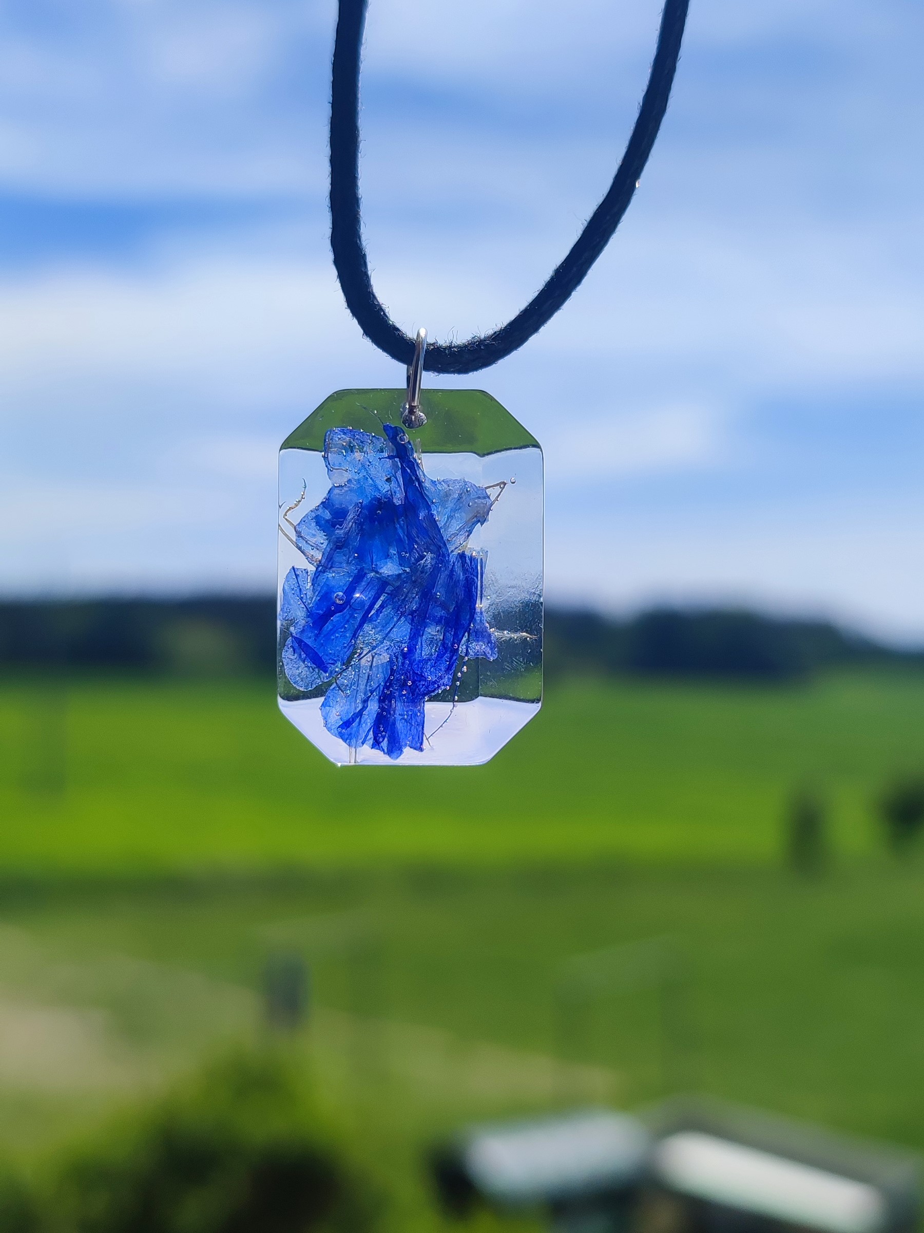 Náhrdelník z křišťálové pryskyřice, okvětní modré plátky Hadince obecného. Visící na voskované šnůrce.