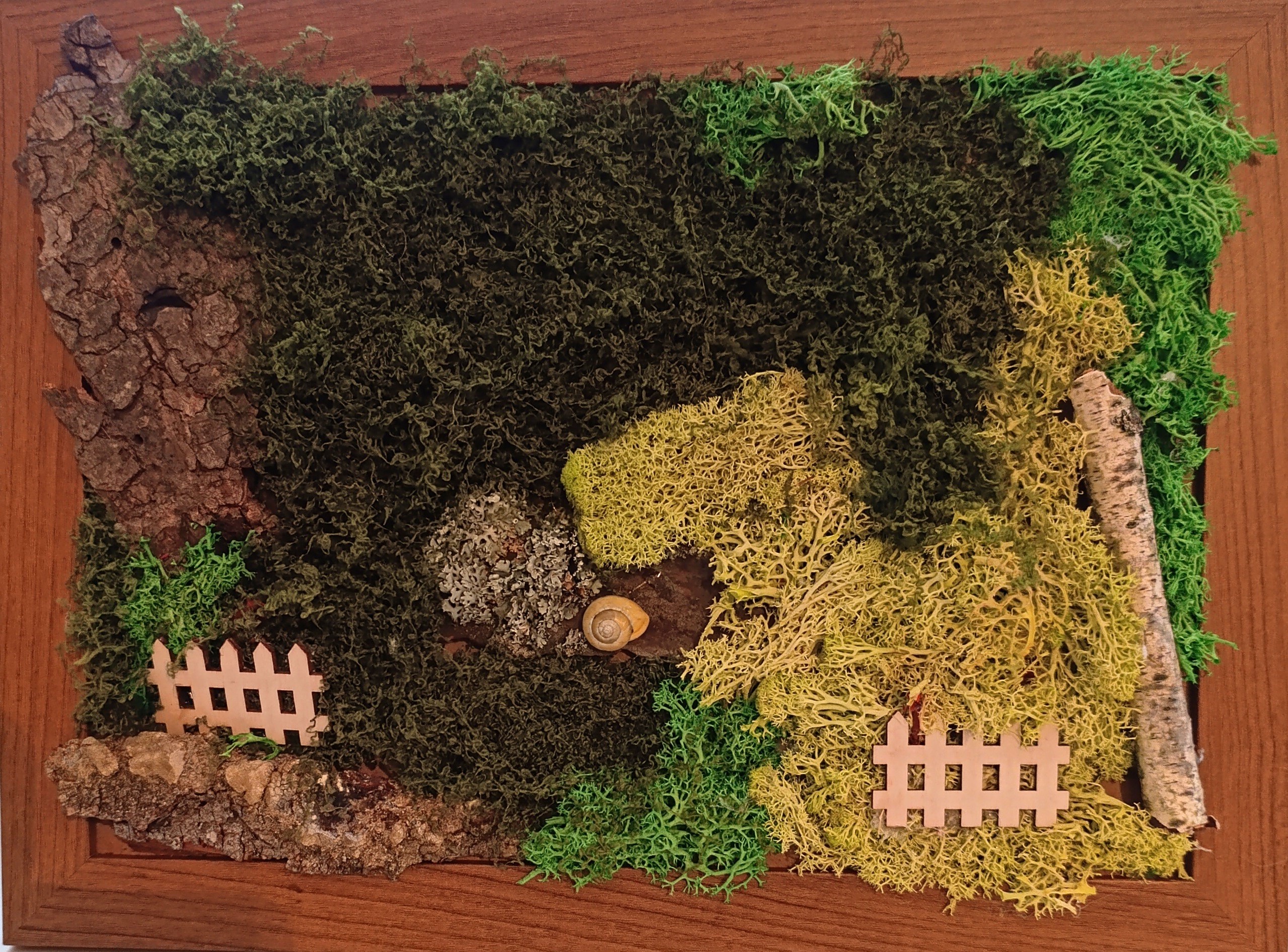 Mechový obrázek velikosti 25×33 cm, mech je stabilizovaný. Je naprosto bezúdržbový. POZOR! Nerosit, nezalévat, došlo by k plísni.